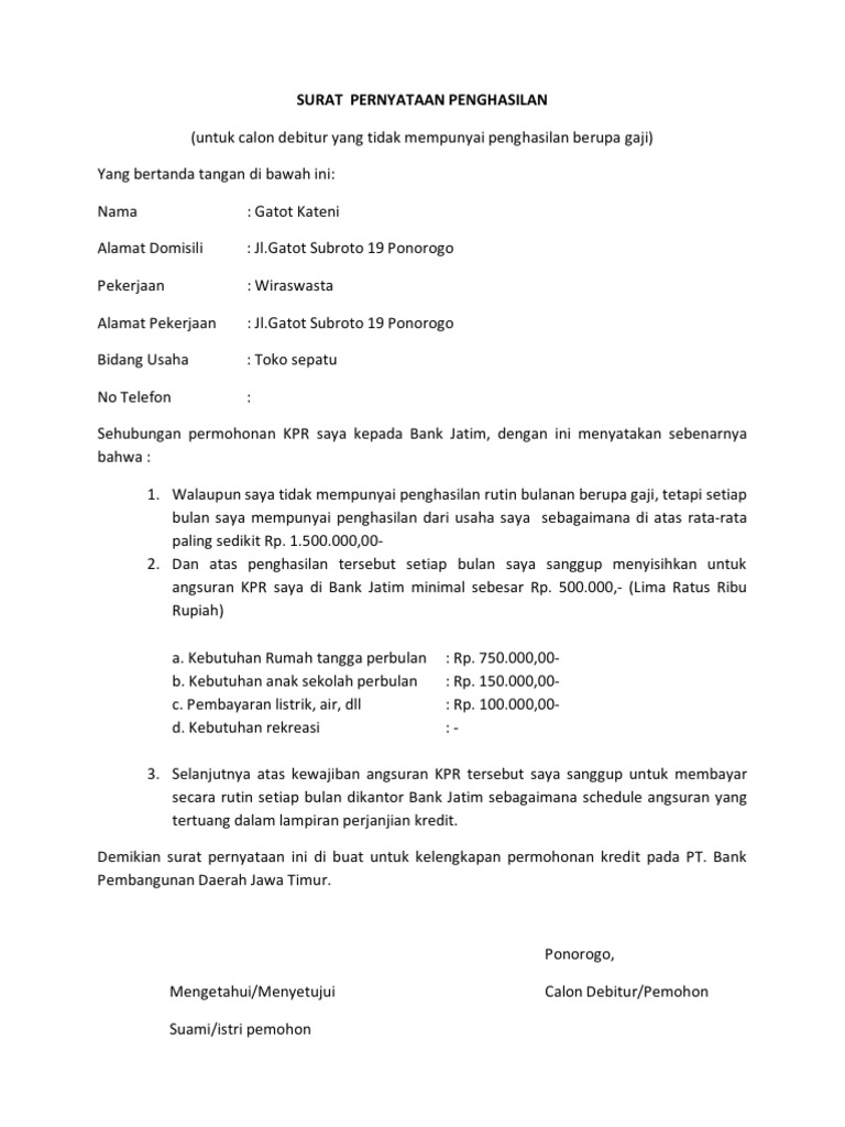 Contoh Surat keterangan penghasilan atau biasa disebut slip gaji merupakan sebuah surat yang biasanya dikeluarkan oleh bagian keuangan sebuah perusahaan. Surat ini bisa digunakan sebagai keterangan yang bisa digunakan untuk mengajukan pinjaman atau kredit. Setelah kesepakatan bersama maka dibuatlah surat pernyataan persetujuan yang menjadi jaminan dan bukti autentik sebelum.